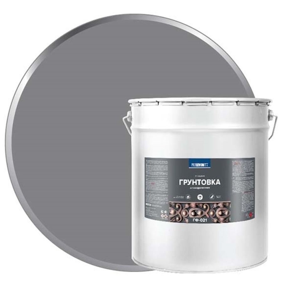 Грунтовка ГФ-021 СЕРЫЙ. 18,0 кг. PROREMONTT. артикул: 0006601 - предназначена для подготовки металлических и деревянных поверхностей к финишной отделке. Благодаря составу, продукт формирует покрытие, которое эффективно защищает основание от коррозии и плесени. Позволяет выравнивать основание, предупреждает отслаивание лакокрасочных материалов, а также снижает их расход. Применение грунтовки продлевает срок службы декоративного слоя.