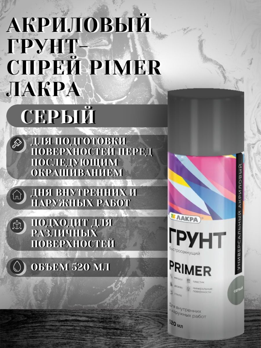 Читать все статьиГрунт-спрей акриловый, универсальный. СЕРЫЙ № 89. 520мл/260гр. Primer ЛАКРА