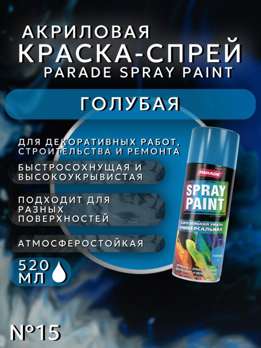 Краска-спрей акриловая. ГОЛУБОЙ № 15. 520мл/280гр. SPRAY PAINT PARADE, артикул: 0006352 / 6972518 / 15 - высококачественная быстросохнущая акриловая эмаль используется в декоративных работах, строительстве и ремонте.