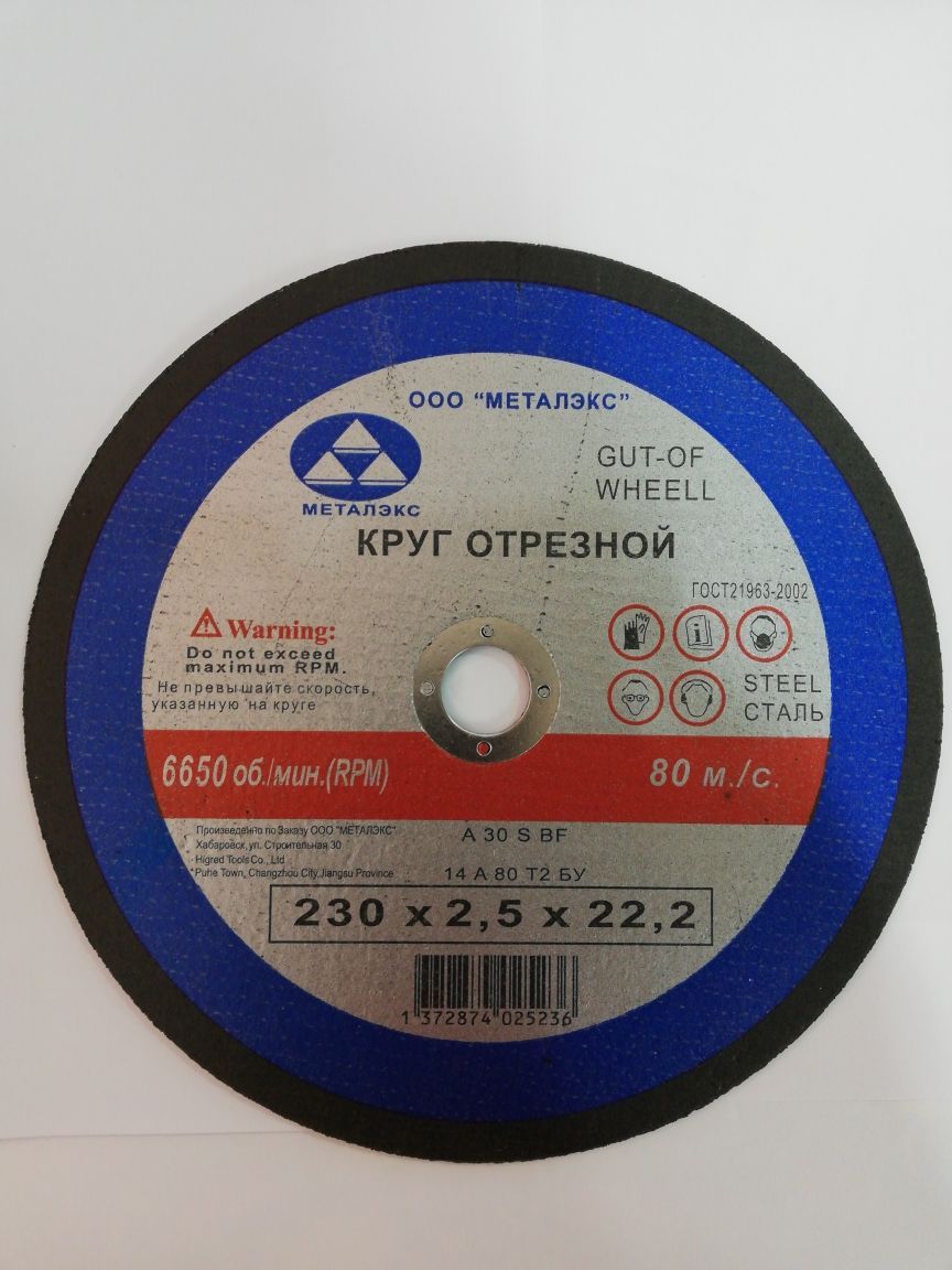 Круг отрезной по металлу 230Х2,5Х22,2мм. Металэкс., используется в угловых шлифмашинах. С его помощью можно осуществлять рез изделий из различных марок стали. Наиболее эффективно применение этой оснастки при резке листового металла. Изготовлен он из специального состава, не содержащего железа, серы и хлора. Благодаря этому во время работы можно избежать «прижогов» разрезаемой заготовки, а также ее загрязнения при дальнейшей обработке.