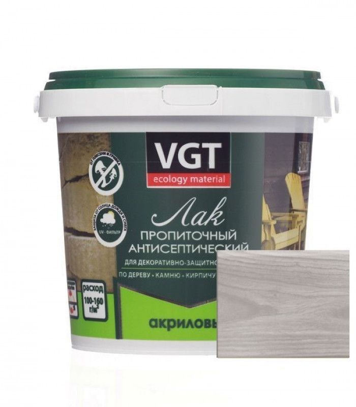 Лак пропиточный антисептический, акриловый. ДУБ СВЕТЛО-СЕРЫЙ. 0,9 кг. VGT, артикул: 021810 - лак для деревянных и минеральных поверхностей, для наружных и внутренних работ, акриловый универсальный VGT - оригинальный сертифицированный продукт от производителя. Предназначен для декоративной отделки и защиты деревянных, кирпичных, бетонных и других минеральных поверхностей, а также природного и искусственного камня, бумажных обоев и стеклообоев. Может использоваться в качестве промежуточного слоя, в том числе для полов. Применяется для наружных и внутренних работ. Свойства: устойчив к действию ультрафиолета (светостойкость соответствует норме по ГОСТ Р 52020-2003); представляет собой молочно-белую гомогенную вязкую жидкость со слабым запахом; при полном высыхании лак образует прозрачную, эластичную, прочную пленку; применяется для наружных и внутренних работ; содержит антисептические добавки; возможна тонировка в любой цвет; устойчив к УФ-излучению. Ориентировочный расход при нанесении кистью на дерево 100-160 г/м² первый слой, 100 г/м² второй слой. Для получения лучшего декоративного эффекта рекомендуется двукратное или многократное нанесение с промежуточной сушкой 1 час.