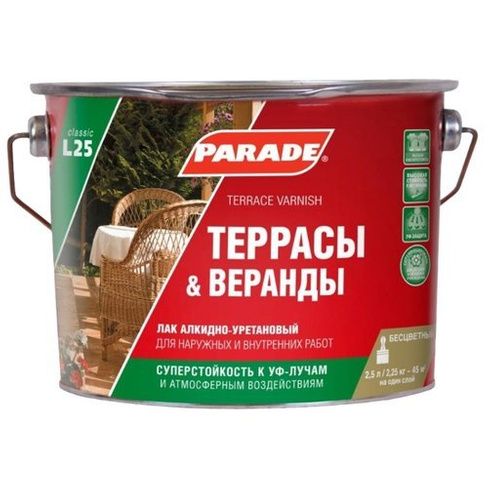 Читать все статьиЛак алкидно-уретановый PARADE L25 Террасы & Веранды Матовый, 2,5л
