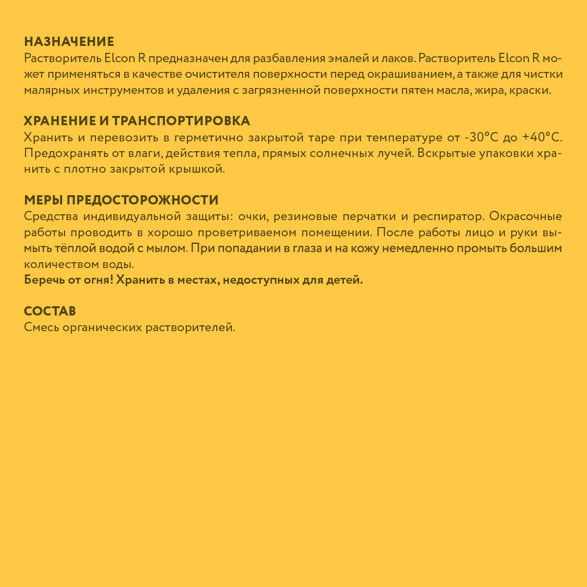 -20 °С до + 35 °С. При разбавлении ЛКМ Elcon R добавляется постепенно, с постоянным перемешиванием. Подробная инструкция