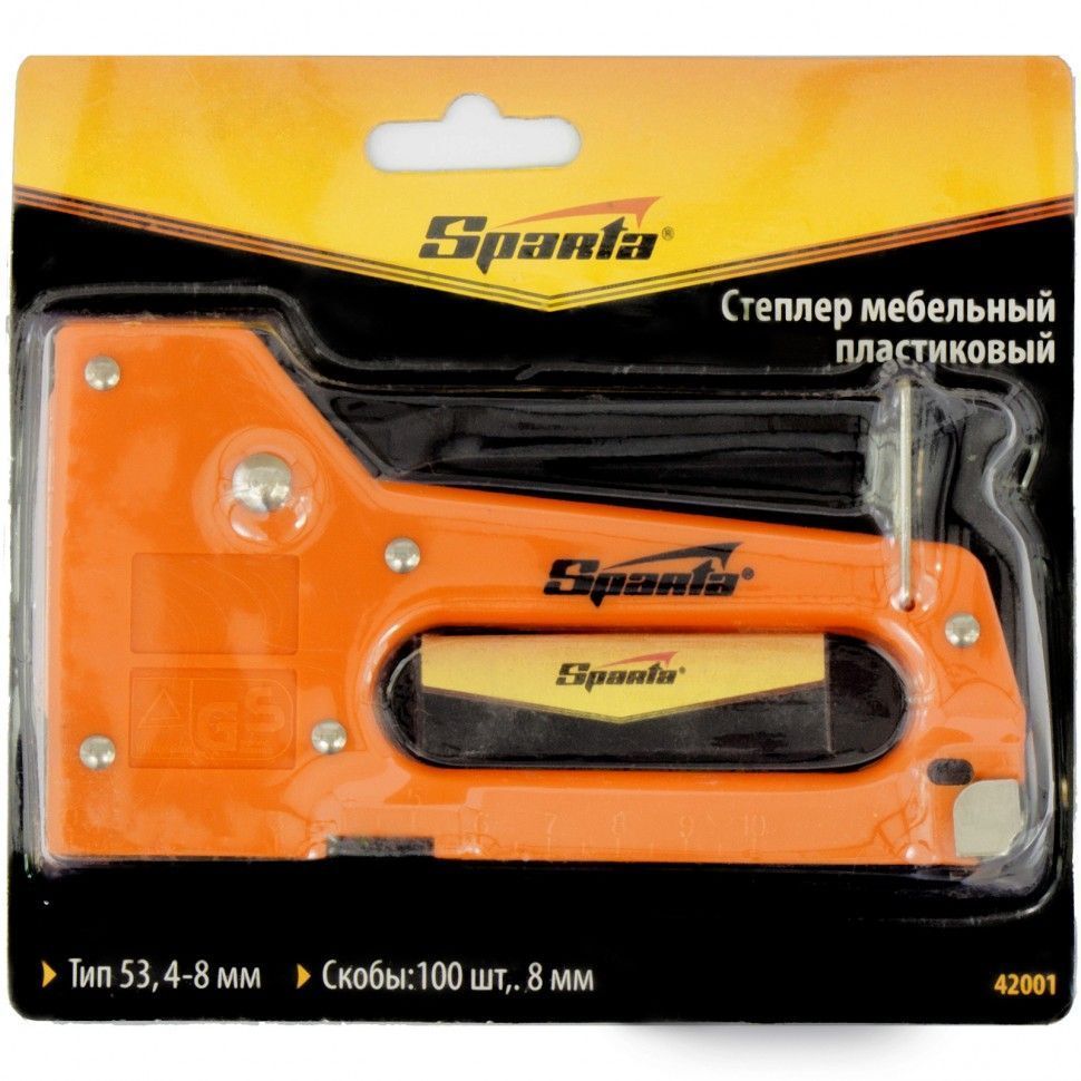 Пластиковый мебельный степлер Sparta 42001 совместим с крепежами типа 53 размером 4-8 мм и поставляется со скобами в количестве 100 шт. Используется для быстрого скрепления с деревянным основанием фанеры, оргалита, ДСП, ДВП, пленки, утеплителя и других листовых материалов. Будет полезен при сборке шкафов, обивке мягкой мебели, при выполнении теплоизоляционных и других крепежных работ.ПреимуществаКорпус изготовлен методом литья из прочного пластика и устойчив к повреждениям.Металлическая скоба-фиксатор удерживает рукоятку в нерабочем положении, предотвращая самопроизвольное срабатывание ударного механизма.В комплекте имеется упаковка из 100 скоб размером 8 мм, поэтому инструмент полностью готов к работе.