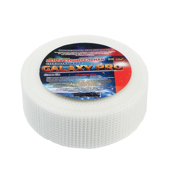 Самоклеящаяся серпянка GALAXY PRO - стеклотканевая лента с клейким слоем, которая служит для упрочнения стыков и защиты от образования трещин в дальнейшем, после застывания шпатлевки. Плотность: 55 г/м2.