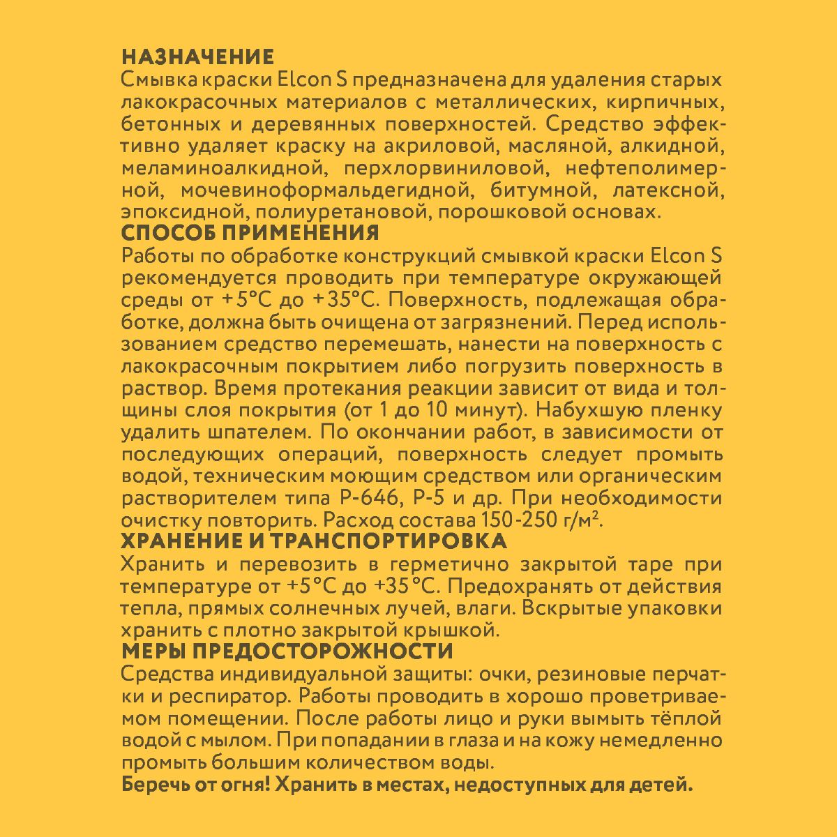 Смывка краски относится к трудногорючим жидкостям. Попавший на открытые части тела состав Elcon S необходимо смыть во-