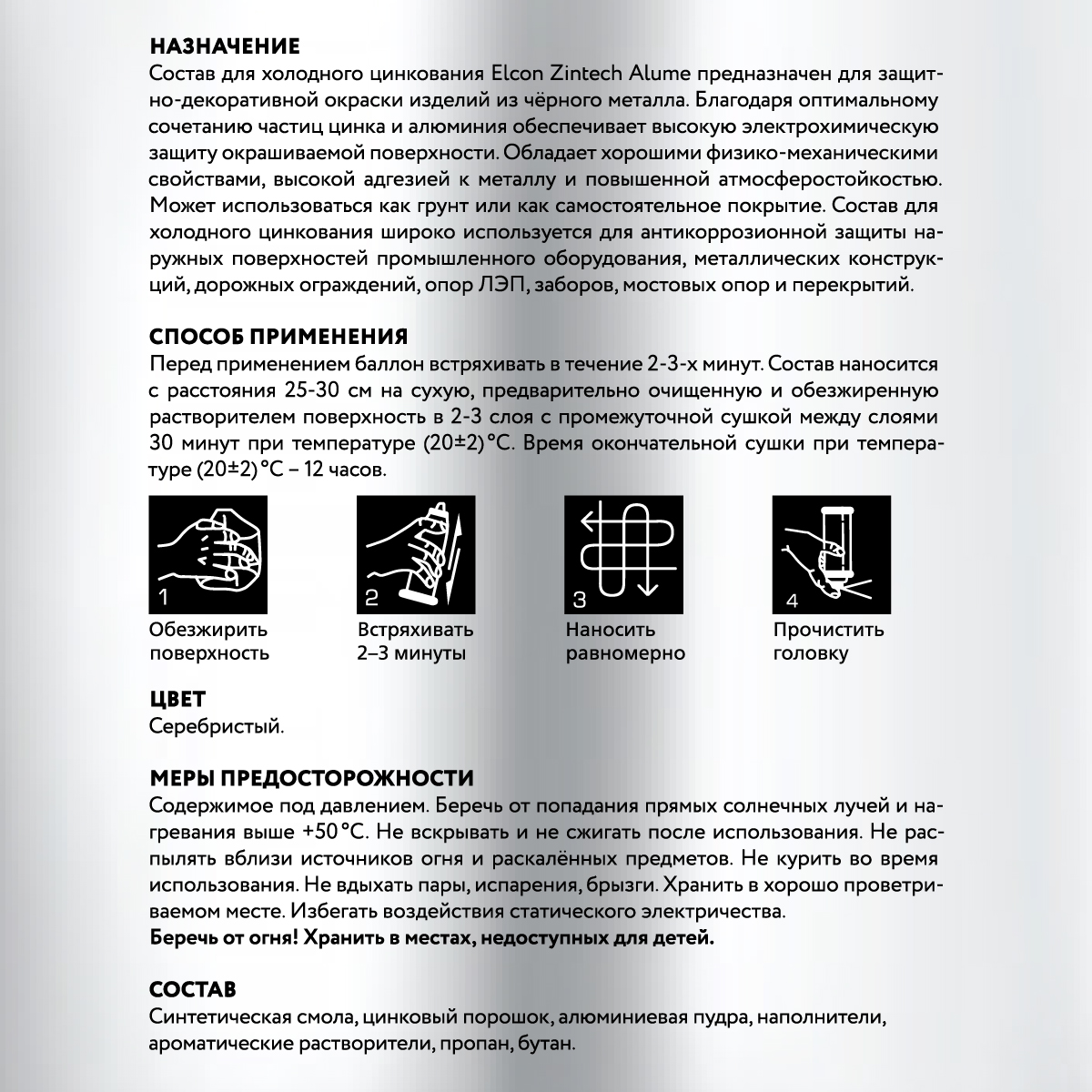 Синтетическая смола, цинк, алюминиевая пудра, ароматические углеводороды, функциональные добавки.