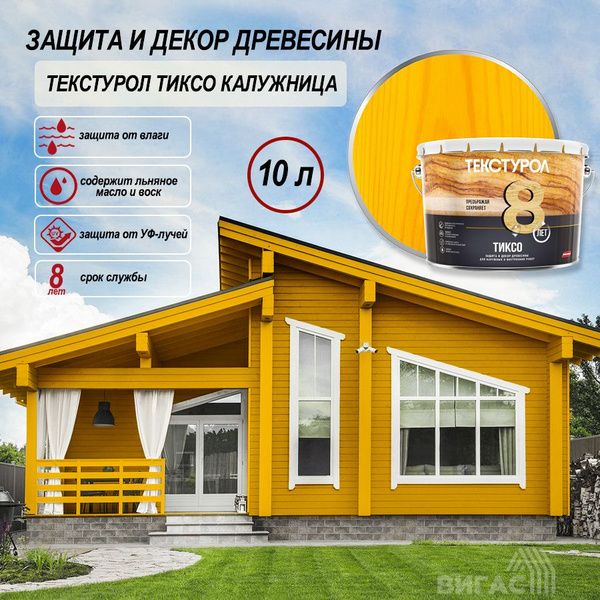 Деревозащитное средство Текстурол серии ТИКСО. КАЛУЖНИЦА. 10,0л артикул: 0014103, штрихкод: 4603292008059 - используют внутри и снаружи помещений для декоративной отделки фасадов и различных конструкций (доски, стеновые панели, оконные и дверные проемы, заборы и ограды) из ДВП, ДСП, фанеры и шпона.
