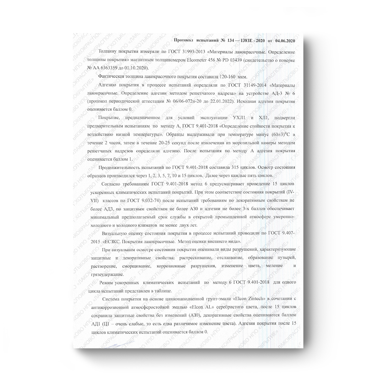 • Протокол испытаний независимой лаборатории НИИ ЛКП «Лакокраспокрытие» по результатам ускоренных климатических испытаний