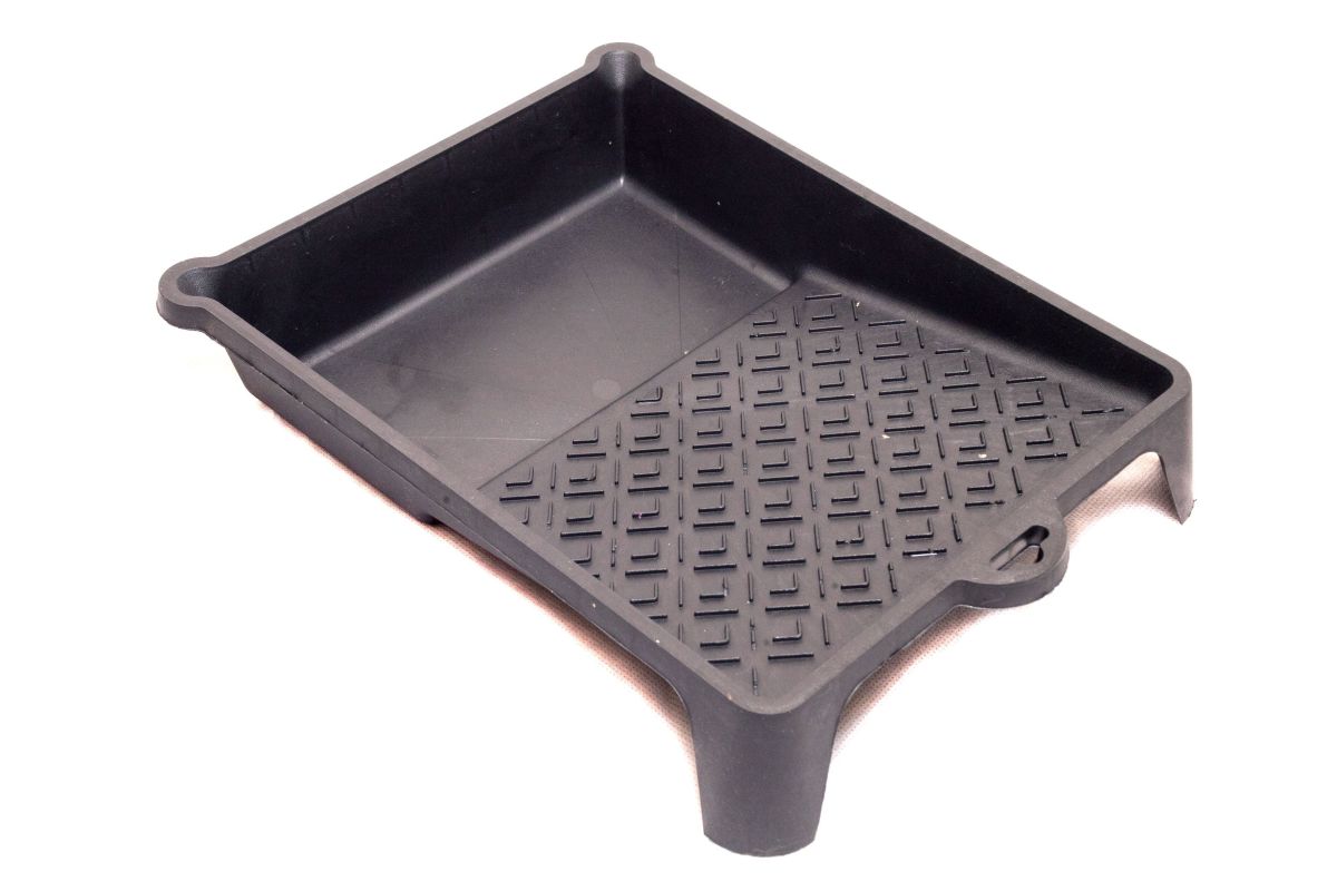 Пластмассовая кювета для валиков, имеет рифлёную наклонную поверхность, что упрощает удаление лишней краски с поверхности валика.